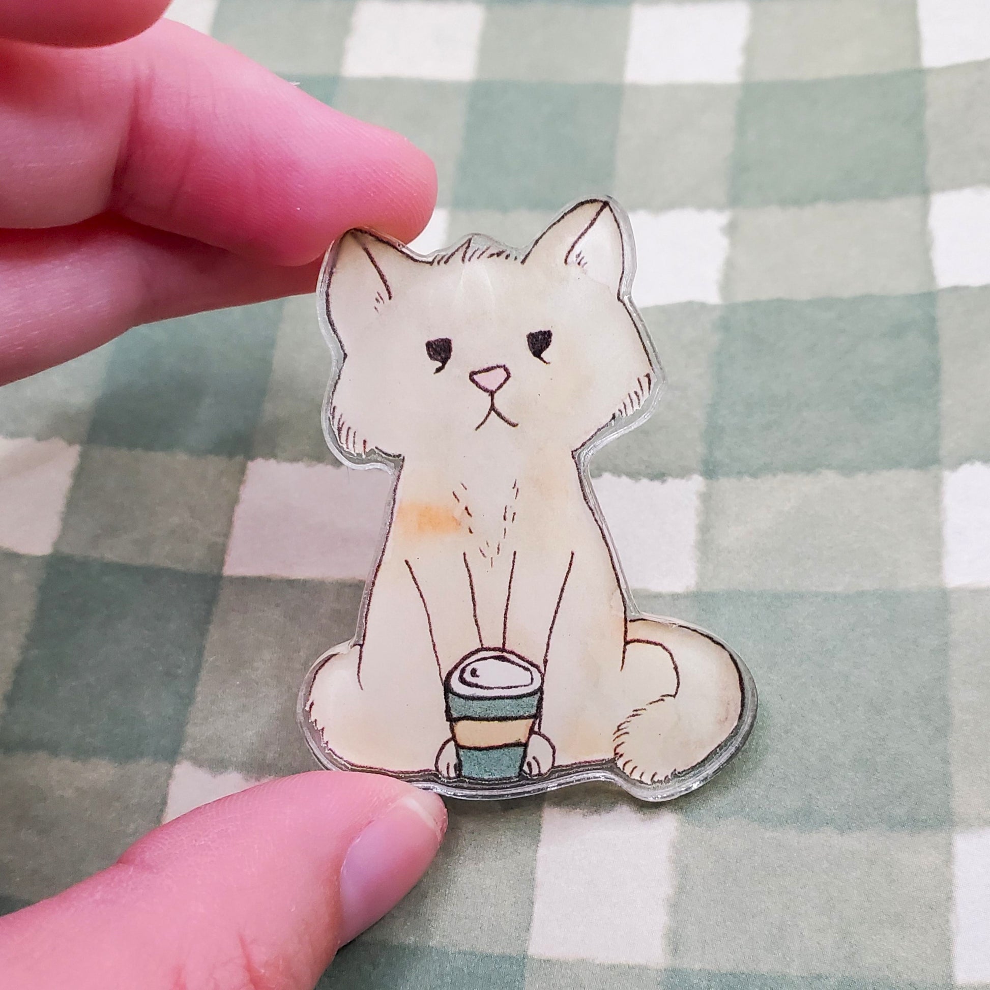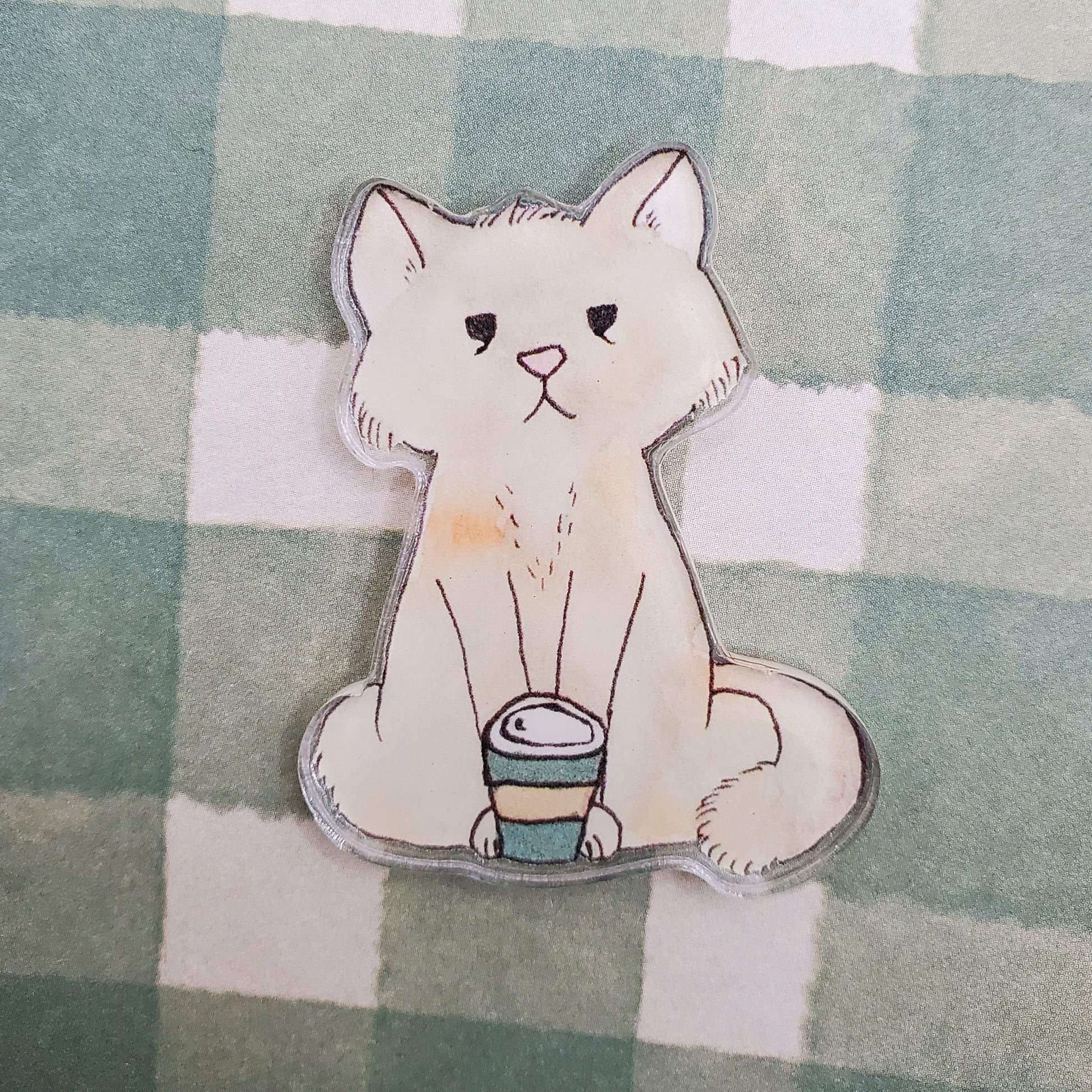 An acrylic magnet of a cat with a cup of coffee! It is 2" tall and 1.5" wide