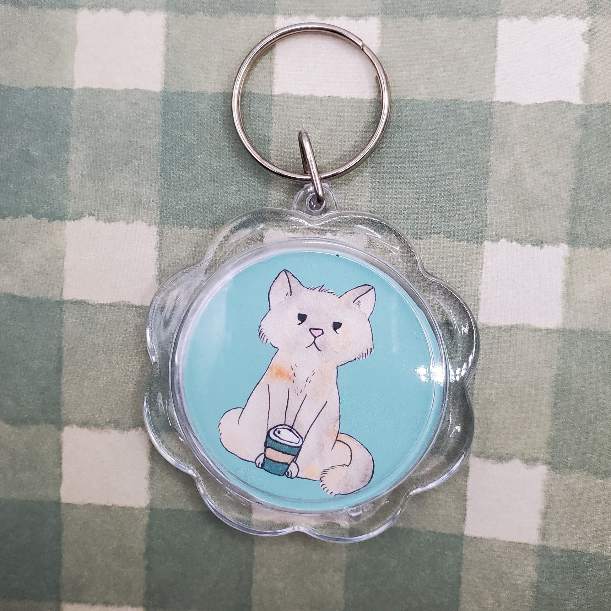 An acrylic, flower-shaped keychain with a cat and a coffee cup image inside. Image is the same on both sides.