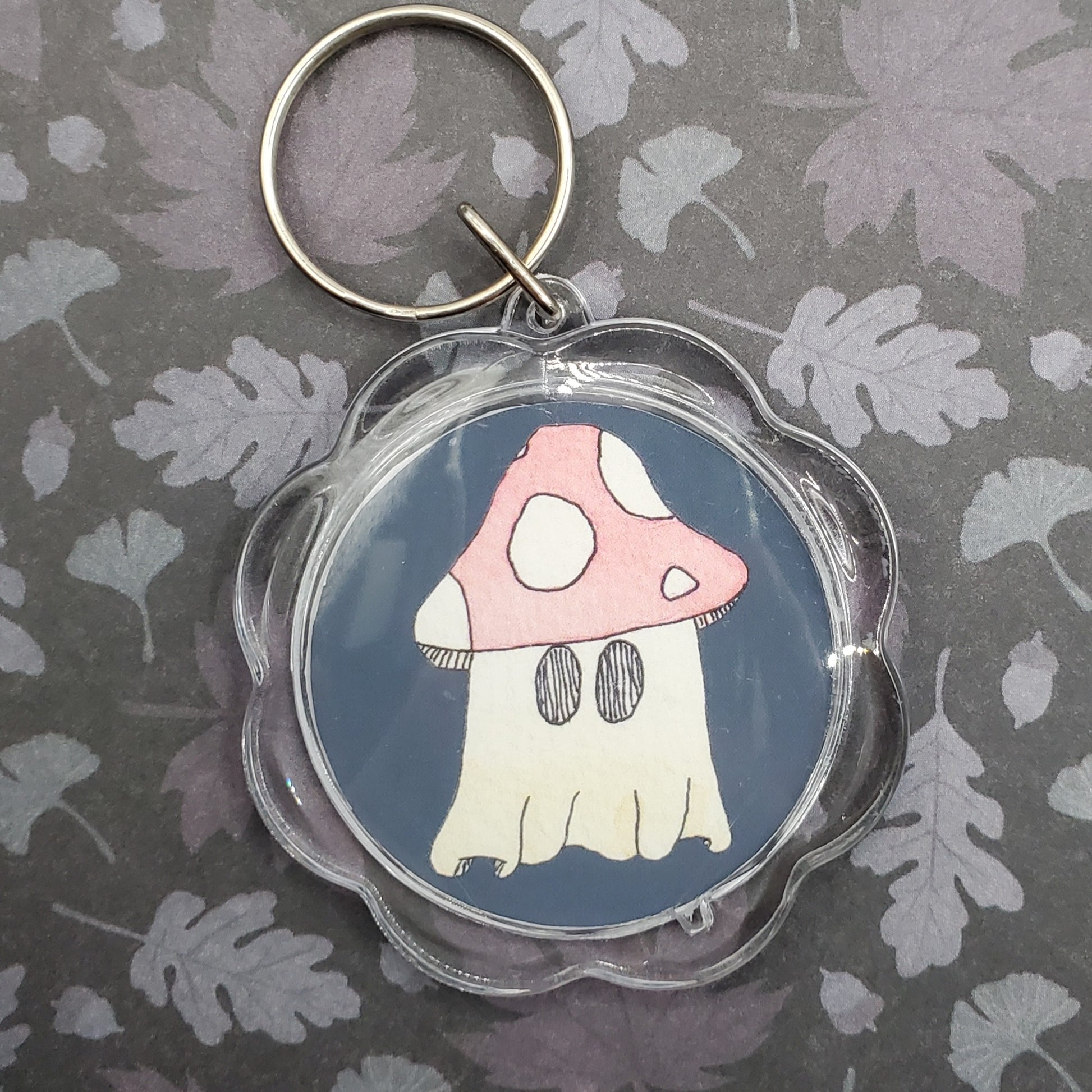 An acrylic, flower-shaped keychain with a mushroom ghost image inside. Image is the same on both sides.