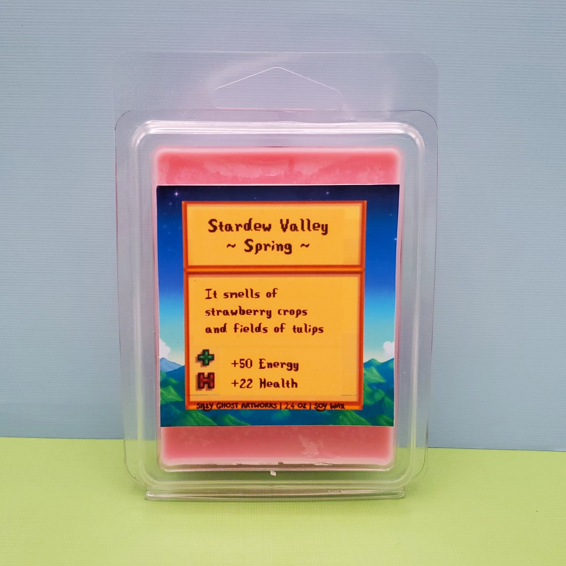 A Stardew Valley themed candle that represents crops from each season. Spring smells like strawberry and roses